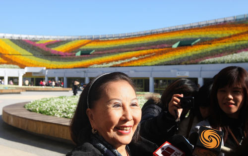 孫中山的孫女孫穗芬(左)28日參觀臺北花卉博覽會,對展區(qū)的內(nèi)容表達肯定。圖片來源:“中央社”