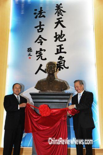 “考試院”6日舉行孫中山銅像揭幕典禮,“考試院長(zhǎng)”關(guān)中(左)與副院長(zhǎng)伍錦霖(右)一起為這座“辛亥百年第一尊”的孫中山銅像揭幕。