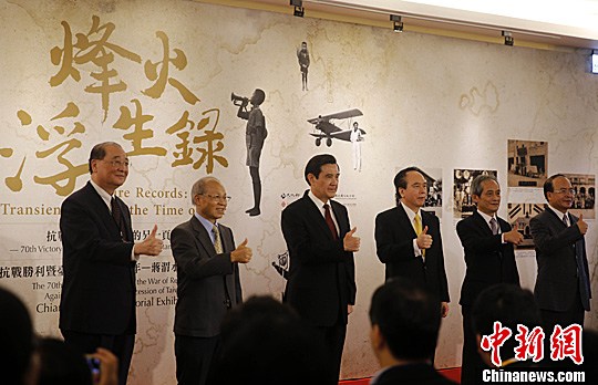 資料圖:抗戰(zhàn)勝利暨臺灣光復70周年,兩場紀念展7月臺北啟幕。臺當局領導人馬英九(左3)出席開幕式。(中新社發(fā) 鄭巧 攝 )