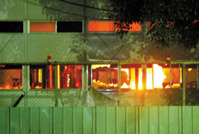 一名消防人員描述現(xiàn)場(chǎng)情況表示,外勞暴動(dòng)地區(qū)內(nèi)有如戰(zhàn)后情景,整排鐵皮工寮被燒光,四處可見零星火源,宿舍玻璃窗全都被砸破,丟出的椅子與各式用品,散落在戶外。直到警方出動(dòng)一百多名警力,把外勞逼退到一棟宿舍,并持盾牌保護(hù)消防車入內(nèi),才完成滅火。但滅火后,外勞又攻擊消防車與警員,所有人員只好撤退。(來(lái)源:中新網(wǎng))