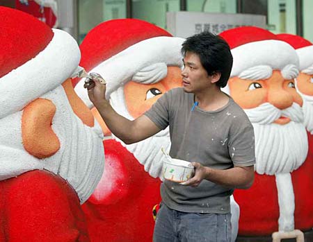 臺(tái)北市街頭近來陸續(xù)開始妝點(diǎn)圣誕樹及圣誕老人等相關(guān)應(yīng)景物品,一家百貨業(yè)者在戶外廣場樹立可愛的圣誕老公公模型,工作人員正仔細(xì)為保麗龍制的作品上色,為漸冷的街頭點(diǎn)綴些許喜慶與溫馨。(據(jù)臺(tái)灣《中國時(shí)報(bào)》報(bào)道)