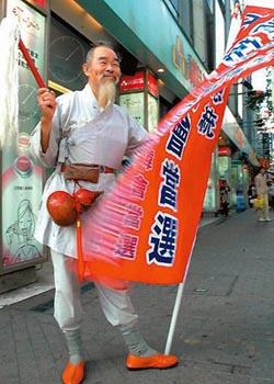 誰會當(dāng)選?經(jīng)常在西門町街頭出現(xiàn)的“凈仙”舉著誰會當(dāng)選的旗幟,預(yù)測下屆“總統(tǒng)”、臺北縣長、臺中市長的當(dāng)選人,在人來人往的西門鬧區(qū)顯得相當(dāng)突兀。(臺灣聯(lián)合報圖)