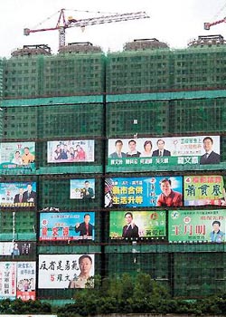 “三合一”選戰(zhàn)已進入倒數(shù)時刻,屬于超級戰(zhàn)區(qū)之一的臺北縣選情緊繃,板橋市一棟正在建造的大樓,成為各候選人兵家必爭之地,掛滿巨型競選布條,格外顯眼。(臺灣聯(lián)合報圖)