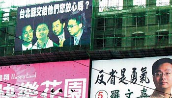 國民黨日前在板橋市豎起選舉廣告牌,上面有陳水扁、羅文嘉、陳哲男、馬永成的照片,只有一句話“臺北縣交給他們您放心嗎?”。右下方是羅文嘉的“反省是勇氣”廣告牌,究竟誰當(dāng)縣長能帶給臺北縣民快樂?將由選票來決定。(臺灣聯(lián)合報圖)