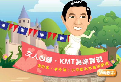 據(jù)臺(tái)灣媒體報(bào)道,馬英九的英挺帥氣迷倒不少女性,早已是眾所皆知,F(xiàn)在,在國(guó)民黨網(wǎng)站上出現(xiàn)了這樣的宣傳活動(dòng),如果答對(duì)了11個(gè)相關(guān)問題,并許下婦女節(jié)的心愿,最后獲得第一名的女性,3月8日當(dāng)天便可以與馬英九相會(huì),并由他親自幫忙實(shí)現(xiàn)愿望。