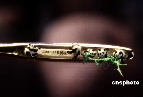 透過(guò)放大鏡,記者才得以窺見(jiàn)陳逢顯新作的無(wú)窮奧妙。國(guó)寶大熊貓是一件與二○○八北京奧運(yùn)有關(guān)的作品:用樹(shù)脂微雕成的五只平均尺寸只有零點(diǎn)七毫米的大熊貓,黑白相間、憨態(tài)可掬。它們或在爭(zhēng)吃細(xì)嫩、翠綠的竹子,或在玩耍展示刻有“二○○八北京奧運(yùn)”字樣的橫幅。這一住在針孔中的大熊貓家族被陳逢顯刻畫(huà)得活靈活現(xiàn)。陳逢顯笑稱(chēng),三只正在吃竹子的小大熊貓還叫著“長(zhǎng)大也要參加奧運(yùn)”呢。他說(shuō),這是他用了六個(gè)月的時(shí)間才完成的作品。