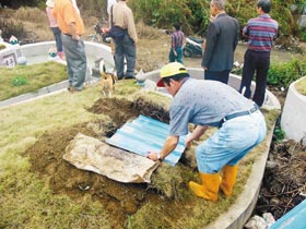 昨天上午,大批萬丹村民到公墓查看,南投市王木川的墳?zāi)贡煌诹艘粋洞,棺材也被敲破,兒子王宗慶看了很難過。因為下雨,王宗慶找來塑膠板蓋在墓地上。他說,父親九二一地震后去世,他每星期都來整理父親的墓園,最近還種上草皮,沒想到竟然被盜。
