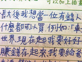 黃姓婦人長子在周記上寫著:長大后想當(dāng)有錢人。