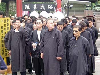 據(jù)臺(tái)灣中時(shí)電子報(bào)報(bào)道,2005年5月,在島內(nèi)素有“黑道仲裁者”之稱的“蚊哥”許海清舉行喪禮,全臺(tái)各幫派動(dòng)員上萬(wàn)人以“輸人不輸陣”的氣勢(shì),身著各幫派及堂口制服,甚至以“黑色人龍”之姿繞街游行臺(tái)北街頭,甚至高調(diào)的舉辦記者會(huì),訂定“黑道平安日”,讓警方顏面無(wú)光。臺(tái)“警政署”最后施以鐵腕,日后的任何一場(chǎng)黑道份子喪禮,均事前強(qiáng)力約制幫派份子參加,甚至強(qiáng)力掃蕩,昔日黑道喪禮的風(fēng)光,幾乎已不復(fù)見(jiàn)。