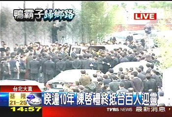 陳啟禮的喪禮上來(lái)自臺(tái)灣與香港的黑衣男女等數(shù)百人迎接。(圖:臺(tái)灣TVBS)
