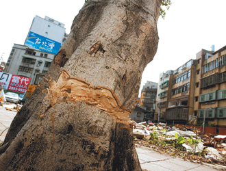 據(jù)臺灣《聯(lián)合晚報》報道,臺北市“議員”接獲民眾檢舉,承德路四段某建地行道樹遭“齊平斷根”,更有一株超過三層樓高的行道樹遭到“環(huán)狀剝皮”,瀕臨死亡。另外,某街的高級建案尚未開工,建商已悄悄將樹木“斷枝”,再把鋸斷處包裹起來。像這樣傷痕累累的行道樹,在臺北市隨處可見。