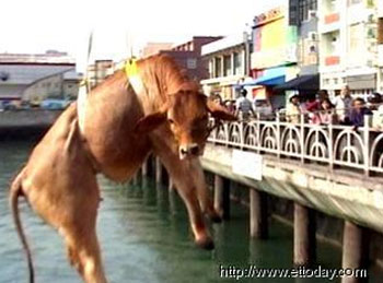 大黃牛拼命仰著頭不讓海水淹過口鼻,在水里載浮載沉,狼狽的任由脖子上的繩索拉著走。好不容易靠近岸邊,幾個人接力試圖將大黃牛拉上石階,但或許是因?yàn)槠咦彀松嗟挠懻撀暫蛧^民眾關(guān)愛的眼神,讓大黃牛嚇到動都不敢動,最后只能請助消防隊(duì)出動吊車。