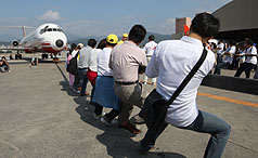 據(jù)“中央社”報道,遠(yuǎn)航宣布舉辦拉飛機活動后,13天共吸引3000人次上網(wǎng)預(yù)測。拉飛機活動上午登場,分成民眾組與網(wǎng)絡(luò)預(yù)測關(guān)注的遠(yuǎn)航員工組等兩場,平常需要40輛車才拖得動的飛機重量,拔河選手從15人開始試?yán),逐次加?人,選手分成兩列,從機鼻左右兩側(cè),用力將機身向前拔行。