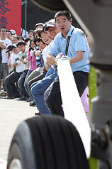 員工組則顯得有備而來,穿著整齊制服,當(dāng)30名選手還拉不動時,遠(yuǎn)航董事長樂大信和總經(jīng)理陳尚群也加入拔河,直到40人終于拖動飛機,多位選手大呼好玩。