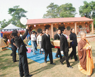 殯葬公司人員為法胖“接體”、洗身、換衣、豎靈、冰存,由六名法師輪流誦經(jīng),并選定安葬在臺南縣新化鎮(zhèn)一家寵物樂園。