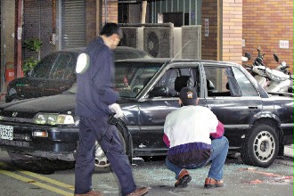 警方鑒識(shí)人員正在被打得稀爛的歹徒座車旁搜證。