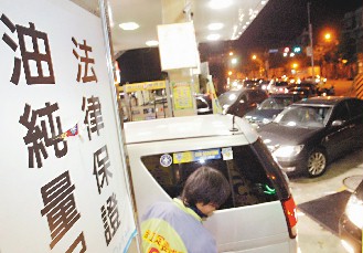 臺(tái)灣傳出加油站賣(mài)假油,一家加油站特意打出“法律保證、油純量足”,讓顧客安心。(聯(lián)合報(bào)圖)
