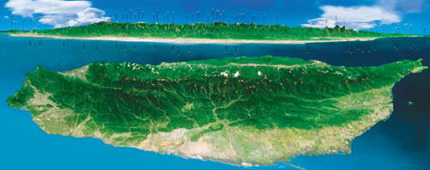 透過衛(wèi)星影像,觀者可由任意角度看見湛藍(lán)海洋中的綠色臺灣。以往由南北角度看臺灣,臺灣像綠色“蕃薯”,現(xiàn)在我們從地平線角度更能看見臺灣山棱的變換,發(fā)揮想象力,臺灣的側(cè)臉還像只迷你“鱷魚”,大屯火山是鱷魚突出的鼻孔,崢嶸山棱是鱷魚的背,恒春半島是鱷魚擺動的尾巴,乘著黑潮在海洋中北游而去。