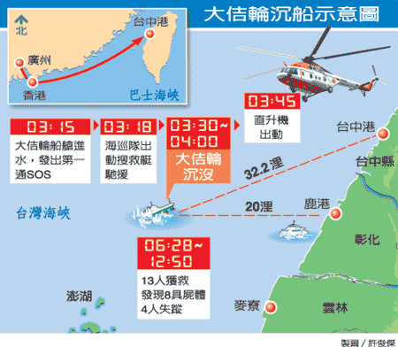 從廣州經(jīng)香港欲前往臺中港的巴拿馬籍貨輪“大佶輪”,昨天凌晨在臺灣地區(qū)彰化縣鹿港附近二十海浬處受巨浪侵襲,船頭傾斜入水,十五分鐘后開始沉沒,有二十五名大陸籍船員及船工落海。臺灣搜救中心出動三艦、四艇及七架直升機,救起十三人,另發(fā)現(xiàn)八具尸體,還有四人失蹤。