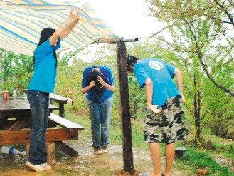 紀(jì)蜜俐在印度邊境村落當(dāng)志工,因水資源珍貴,臺(tái)灣的志工擔(dān)心浪費(fèi)當(dāng)?shù)貎?chǔ)水,不敢洗澡,臺(tái)風(fēng)前下了一場(chǎng)大雨,大伙興奮地在雨中洗頭。 聯(lián)合報(bào)圖