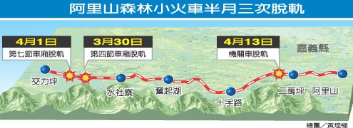 阿里山小火車上月30日第一次發(fā)生脫軌意外,調(diào)查發(fā)現(xiàn)疑似邊坡石塊滾落,導(dǎo)致第4節(jié)車廂傾斜;第二次是4月1日,后方的機(jī)關(guān)車車輪打滑,推擠第7節(jié)車廂,造成脫軌。嘉義林管處隨即將原來以兩輛機(jī)關(guān)車推拉8節(jié)車廂行駛的方式,改由一輛機(jī)關(guān)車推進(jìn)5節(jié)車廂。(高大林)