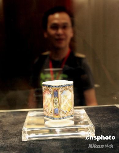 五月二十一日,香港佳士得2008年春季拍賣會預展上,臺灣著名企業(yè)家及收藏家曹興誠捐出去年用六千七百五十萬港元拍得的清乾隆制料胎畫琺瑯西洋母子圖筆筒作慈善拍賣,屆時拍賣所得一半將捐給臺灣紅十字會及法鼓山支援中國四川地震賑災,余款分別捐于臺灣其它非盈利機構。 中新社發(fā) 王麗南 攝