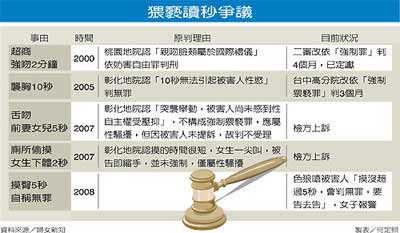 “襲胸十秒無罪事件”,發(fā)生在05年11月,彰化員林內(nèi)衣特賣會(huì)上發(fā)生女子遭摸胸的事件,檢方依強(qiáng)制猥褻罪起訴后,彰化地院以10秒鐘無法引起加害人性欲為由,判定無罪。