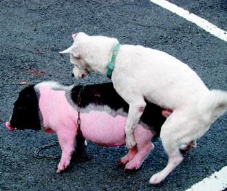麝香豬的女主人,在嘉義市一家洗車場任洗車工,前天下午帶著麝香豬“曼尼”到洗車場,就讓愛豬在空地閑逛。一只十歲的土狗“拉奇”看到麝香豬后立即沖上前,麝香豬受到驚嚇,發(fā)出刺耳的尖叫四處逃竄,土狗卻硬將麝香豬“撞倒”,接著聞遍全身,最后“侵犯”了麝香豬。