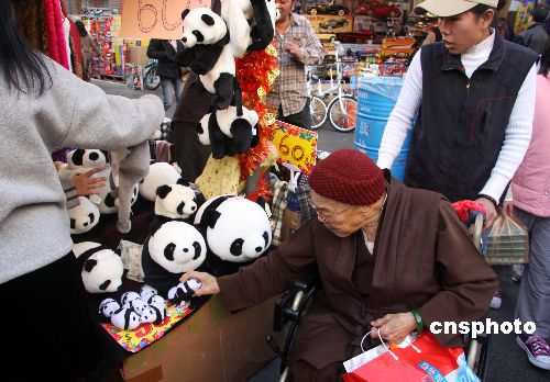 1月17日,距農(nóng)歷年除夕不到十天,盡管經(jīng)濟(jì)不景氣,但臺北年貨大街仍是人流如潮。圖為“團(tuán)團(tuán)”“圓圓”熊貓玩具吸引了老奶奶的目光。 中新社發(fā) 陳立宇 攝