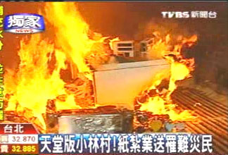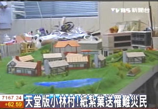 中新網(wǎng)9月4日電 臺(tái)灣“八八水災(zāi)”毀了高雄縣小林村,3日正逢中元節(jié),臺(tái)北縣有家專(zhuān)門(mén)制作“天堂配件”的紙?jiān),為讓死者安息,連夜趕工蓋出“天堂版小林村”,里頭除了住家、學(xué)校以及商店街,希望火化后,能讓不幸的罹難者,在天上有棲身之地。