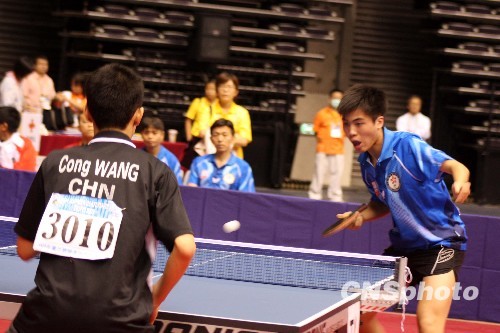 9月6日,第21屆聽障奧運會賽事首日,中國隊全面出擊,參加乒乓球、籃球、羽毛球等多個項目比賽。上午在臺北小巨蛋率先登場的乒乓球男團比賽,3名中國聽障小伙子出場,3:0擊敗中國香港隊。圖左為中國聽障運動員王聰。 中新社發(fā) 董會峰 攝