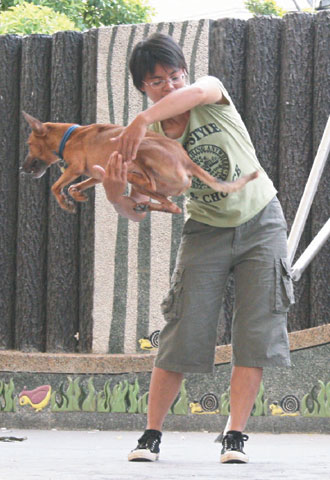中新網(wǎng)9月7日電 據(jù)臺灣《聯(lián)合報》報道,臺灣動物防疫所6日在中壢市中正公園舉辦2009寵物節(jié),舞臺上有敗犬女王走秀、寵物變裝秀,有黃色土狗上臺秀才藝,表演中槍、連續(xù)翻滾、跳圈圈,博得熱烈掌聲。