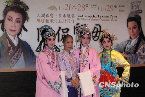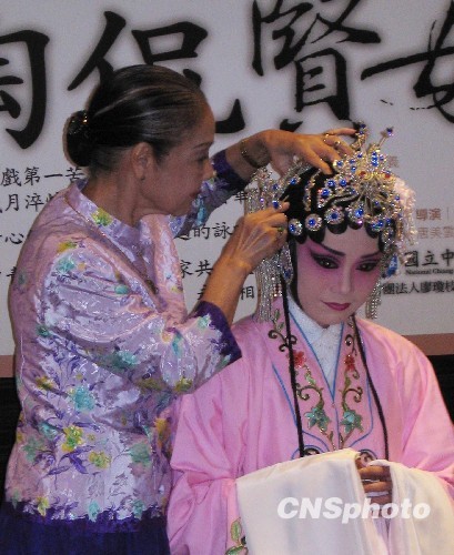 9月11日,被譽(yù)為“臺(tái)灣第一苦旦”的歌仔戲藝術(shù)家廖瓊枝在臺(tái)北宣告隱退!跋颉焙,她將退居幕后全身心投入歌仔戲傳承與創(chuàng)作工作。在其封箱之作《陶侃賢母》記者會(huì)上,七十五歲高齡的廖瓊枝更親自為傳承弟子插上珠花,以此舉釋放出臺(tái)灣歌仔戲界將全力培養(yǎng)第一苦旦接班人的美好信息。 中新社發(fā) 李佳佳 攝