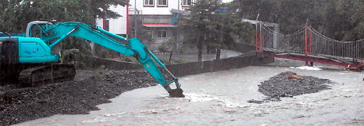 災(zāi)情最嚴(yán)重的是冬山鄉(xiāng)的太和村,上游的十三份溪在上次芭瑪臺風(fēng)來襲時,溪里大量土石淤積,還來不及全部清除,這次又逢大雨,溪水暴漲淹到路面,多條農(nóng)路封閉?h府工務(wù)處緊急出動3臺挖土機(jī)疏浚十三份溪,避免溪水的水位持續(xù)升高,造成更嚴(yán)重的災(zāi)情。