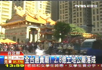 中新網(wǎng)1月19日電 據(jù)臺(tái)灣TVBS報(bào)道,臺(tái)北縣的深丘福德宮,因?yàn)樯w在黃金地段的新板特區(qū),以2年前一平米200萬(wàn)(新臺(tái)幣 下同)的地價(jià)計(jì)算,這間土地公廟地價(jià)已經(jīng)高達(dá)2.8億,號(hào)稱(chēng)是全臺(tái)最貴的廟。之前因?yàn)椴少?gòu)法遲遲無(wú)法完工,最近終于蓋好了,上午舉行安座大典,神明搬新家,場(chǎng)面相當(dāng)熱鬧。