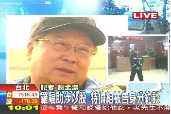 據(jù)臺灣TVBS電視臺報(bào)道,臺特偵組偵辦前“立委”羅福助涉嫌炒股案,經(jīng)過2年監(jiān)聽,今日下午羅福助以被告身份首度被臺特偵組約談,地點(diǎn)在北機(jī)組。被約談?wù)叱_福助之外,也同步約談證券商及金主等;原本昨日就要約談羅福助,羅福助臨時請假改在今日下午才向臺檢調(diào)部門說明。