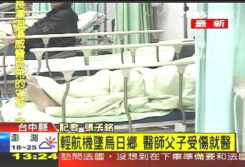 據(jù)報道,黃姓父子二人早上9點半,搭乘輕航機從彰化起飛后,到10點多不知何因墜毀在臺中縣烏日鄉(xiāng),2人已經(jīng)被送往南投佑民醫(yī)院治療。院方表示,兒子腰椎受傷,父親身體多處擦傷,還好傷勢并不嚴重,經(jīng)過簡單包扎后已回家休養(yǎng)。(王賽賽)