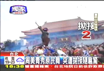 據(jù)臺(tái)灣TVBS電視臺(tái)報(bào)道,俏皮擺頭、踏方塊步,周美青跳原住民舞蹈,難得輕松活潑。馬英九夫人前一天看音樂(lè)劇,劇場(chǎng)外上演番外篇。周美青親自下海,一旁隨扈貼身保護(hù),跟輕松的舞步顯得格格不入。