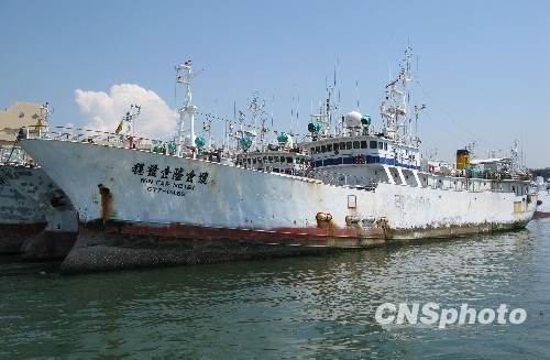 去年4月在西印度洋遭索馬里海盜挾持的臺灣遠洋漁船“穩(wěn)發(fā)161號”,歷經各方營救,終于在遭挾持10個多月后,包括船長顏勝男等共28人返回高雄港。圖為“穩(wěn)發(fā)161號”現(xiàn)?扛咝矍版(zhèn)漁市場碼頭。 中新社發(fā) 耿軍 攝