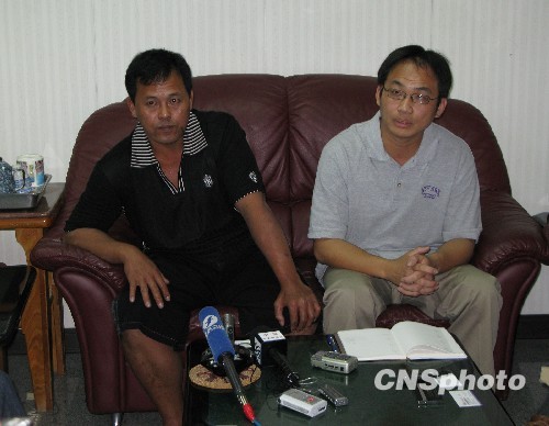 去年4月在西印度洋遭索馬里海盜挾持的臺灣遠洋漁船“穩(wěn)發(fā)161號”,終于在遭挾持10個多月后,經大陸海軍526艦接護返回高雄港。圖為3月6日“穩(wěn)發(fā)161號”船長顏勝男(左)、穩(wěn)發(fā)漁業(yè)公司經理劉銘復(右)在高雄接受大陸記者采訪,他們感謝大陸船東協(xié)會提供及時幫助、海軍提供柴油、伙食和護航。 中新社發(fā) 耿軍 攝
