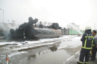 臺(tái)中港消防隊(duì)昨天上午11點(diǎn)52分接獲通報(bào)說(shuō),臺(tái)中港西碼頭南堤路轉(zhuǎn)彎處發(fā)生化學(xué)槽罐車火爆炸,起火地點(diǎn)在“中油”臺(tái)中液化天然氣站圍墻旁,緊臨廠內(nèi)3座液化天然氣罐,萬(wàn)一引燃,后果不堪設(shè)想。