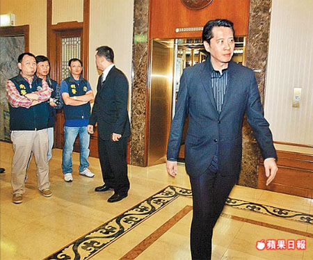 藍、綠政治人物均到場,臺北市議員歐陽龍(右)餐后離開會場。 來源:臺灣《蘋果日報》
