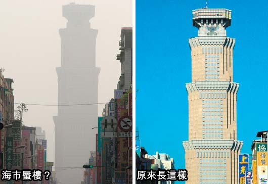 左為,沙塵暴侵襲高雄市,從熱河街看高雄長(zhǎng)谷世貿(mào)大樓(50層)一片灰蒙,仿佛是在沙漠中看到的海市蜃樓。右為沒有沙塵暴時(shí),在熱河街可以清楚看見長(zhǎng)谷世貿(mào)大樓。圖片來源:臺(tái)灣《聯(lián)合晚報(bào)》