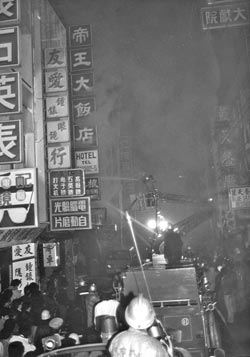 1985年臺南帝王大飯店大火造成28死,縱火主嫌之一的陳東榮逃亡近25年落網。圖為案發(fā)當時救援場面。圖片來源:臺灣《中國時報》