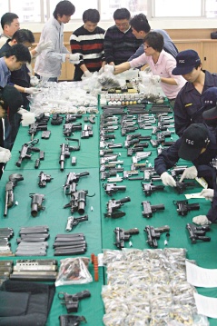 高雄市警局三民二分局昨天破獲軍火集團,查獲58支制式槍械及上萬發(fā)子彈,各式槍支排開十分壯觀。