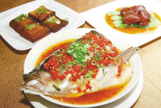 菜色包括剁椒魚(yú)頭(前)、毛家紅燒肉、火宮殿臭豆腐 。