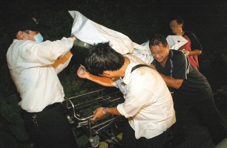 臺北縣爆發(fā)警消人員涉嫌與殯葬業(yè)者勾串大賺死人錢案,檢方昨天約談涉案人到案。圖為一般業(yè)者搬運、處理浮尸遺體情形。圖片來源:臺灣《聯(lián)合報》