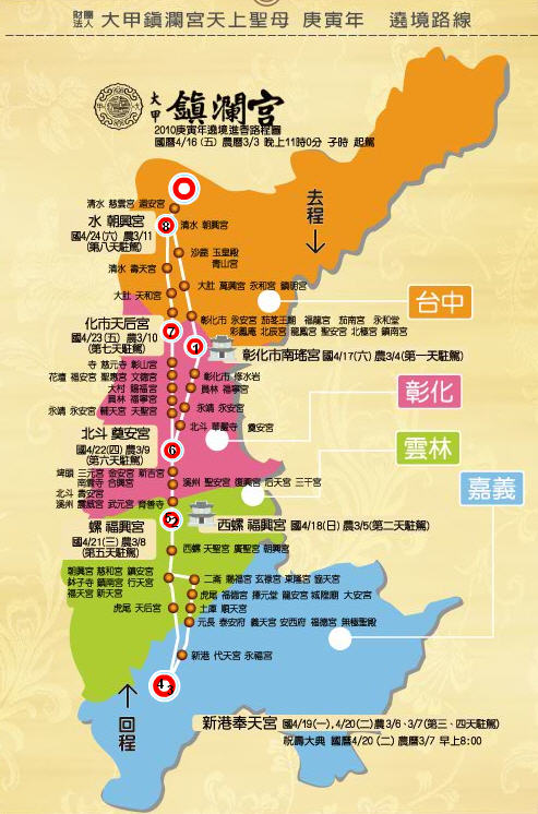 本年度鎮(zhèn)瀾宮大甲媽祖繞境行程示意圖。圖片來源:臺(tái)中縣大甲鎮(zhèn)瀾宮