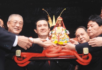 馬英九(中)昨天到鎮(zhèn)瀾宮親送媽祖上鑾轎,吳敦義(左一)、鎮(zhèn)瀾宮董事長顏清標(biāo)(右一)等扶持。來源:臺灣《聯(lián)合報》