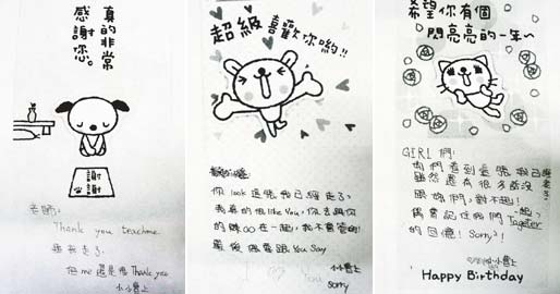 左:給老師和同學(xué)曹姓女童寫給老師的遺書,告訴老師“謝謝你”。中:女童遺書還寫給自己最喜歡的班上男生,說(shuō)不在意他去找陳某某,而且還是很愛(ài)著他。右:寫給同班“GIRL們”的卡片,告訴好姊妹當(dāng)她們看到這張卡片時(shí),“我已經(jīng)走了”。圖片來(lái)源:臺(tái)灣《聯(lián)合報(bào)》